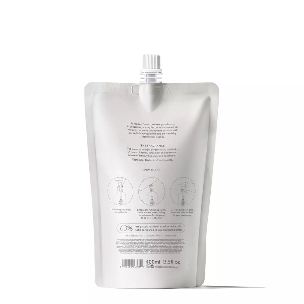 يمكن استخدام أكياس إعادة الملء هذه مع قنينة زجاجية جميلة قابلة لإعادة الاستخدام للحصول على تجربة تُعد ، في نفس الوقت ، متعة فاخرة ولطفًا على البيئة.